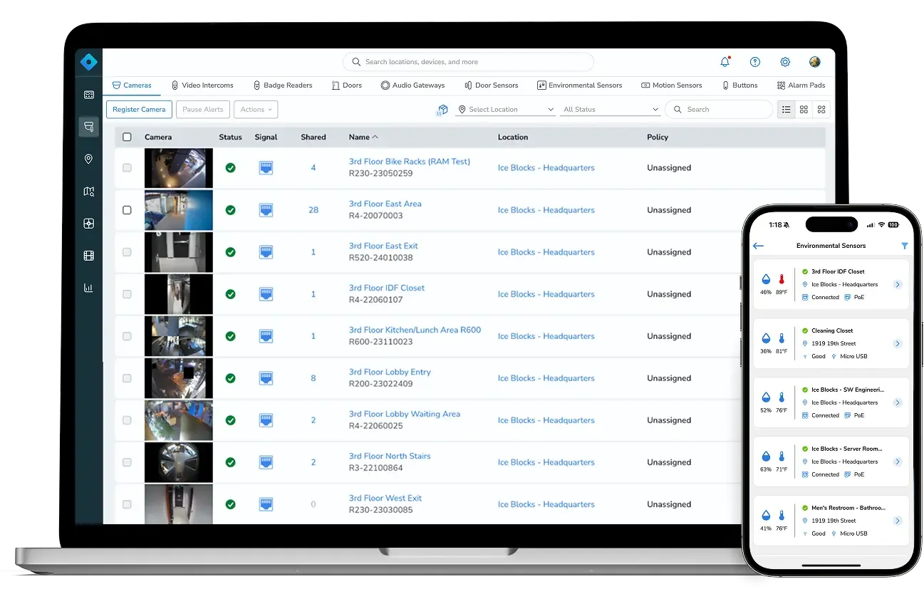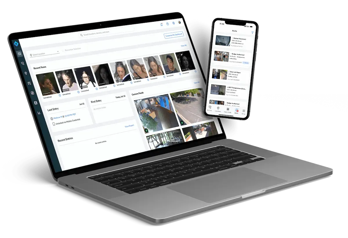 An integrated platform for cameras, access control, and sensors - with remote access via desktop or mobile app - to gain comprehensive visibility into your locations, and simplify user management.